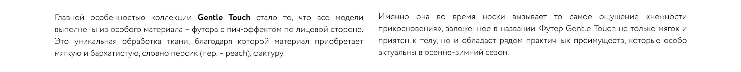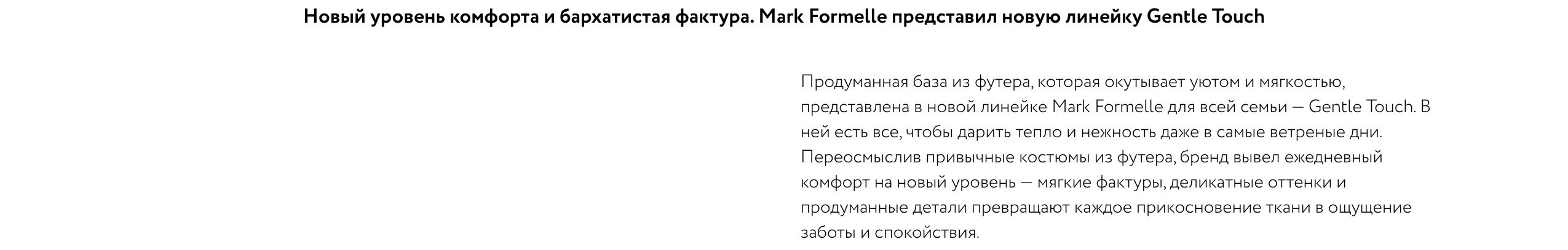 «Комфортные комплекты в новой линейке Gentle Touch создают идеальную основу для ежедневных образов, сочетая мягкость и практичность. Mark Formelle сделал актуальные модели из футера более бархатистыми, тёплыми и износостойкими, при этом сохранив лаконичный стиль и премиальное качество. Благодаря такой доработке изделия дарят чувство уюта, сравнимое с прикосновением нежных объятий. Кстати, все изделия Gentle Touch отмечены специальным навесным ярлыком, чтобы вы легко могли найти их в магазине»