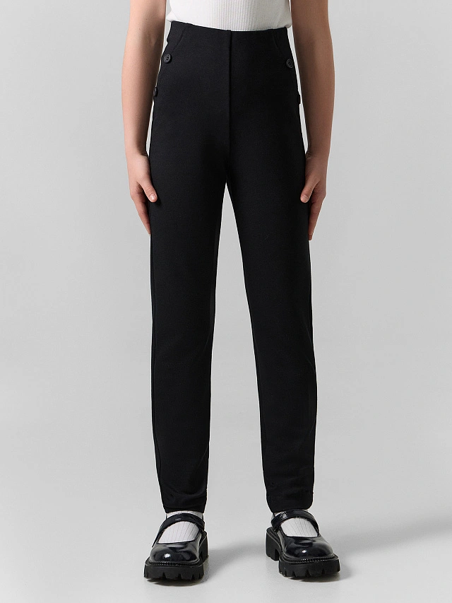 Брюки облегающего силуэта с завышенной посадкой. К верхнему срезу притачивается внутренняя эластичная тесьма 30RV и отгибается внутрь. На передних деталях пуговицы d=15 мм. По бокам декоративные отстрочки. Низ изделия обработан швом в подгибку на 2-х игольной плоскошовной машине.