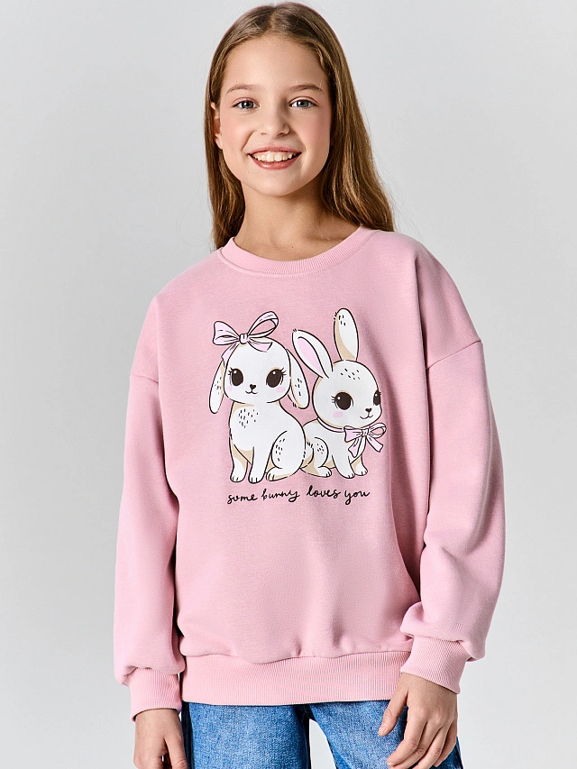 Розовый свитшот для девочек с надписью «Какой-то кролик тебя любит» — отличный вариант для школы, прогулок и повседневной носки. Свободный силуэт со спущенным плечом и длинными рукавами обеспечивает удобную посадку и полную свободу движений.