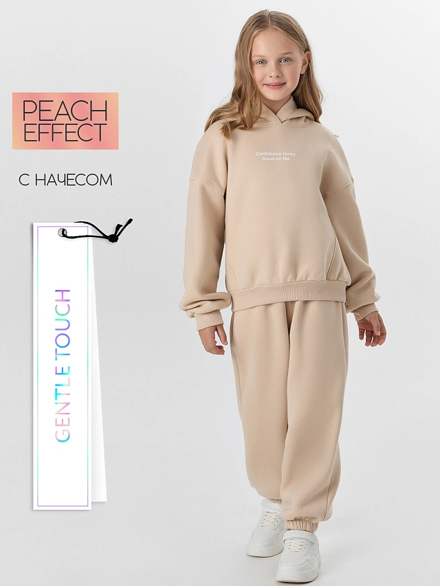 Мягкий начес внутри комплекта обеспечивает дополнительный комфорт и тепло. Натуральный хлопок в составе позволяет коже дышать, а полиэстер сохраняет форму после активных игр. В этом комплекте ваша дочь будет чувствовать себя уверенно и уютно в школе, на прогулке или в гостях. Оцените преимущества пич-эффекта — технологию, которая делает детскую одежду особенно нежной и приятной.