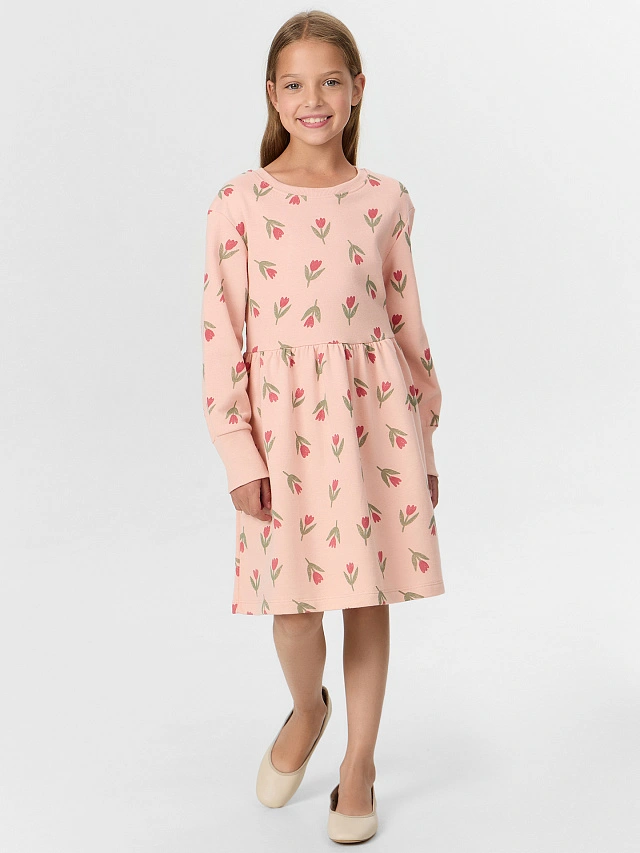 Платье для девочки с цветочным принтом выполнено в нежном розовом оттенке с рисунком тюльпанов, что создает ощущение весенней свежести. Эта модель идеально подойдет для праздничных мероприятий, прогулок или повседневной носки. Если вы ищете, где купить детское платье с качественной отделкой и вниманием к деталям, этот вариант станет прекрасным решением.