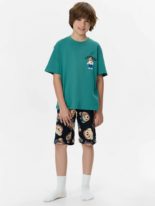 Этот домашний комплект для мальчиков — удобный и практичный выбор для отдыха и сна. Футболка свободного силуэта обеспечивает комфортную посадку. Круглая горловина с обтачкой из рибаны добавляет мягкости и эластичности, обеспечивая удобство при носке. Свободные рукава и слегка спущенная линия плеча создают расслабленный силуэт, а обработка низа рукавов и футболки швом в подгибку делает изделие аккуратным и долговечным. Шорты ниже колена свободного силуэта и с высокой посадкой на талии обеспечивают максимальное удобство, создавая ощущение свободы движений. Эластичный пояс мягко фиксирует изделие, а обработка низа шорт швом в подгибку делает модель надежной и устойчивой к износу. Этот комплект из натурального хлопка идеально подходит для домашних образов, сочетая комфорт, практичность и стиль!
