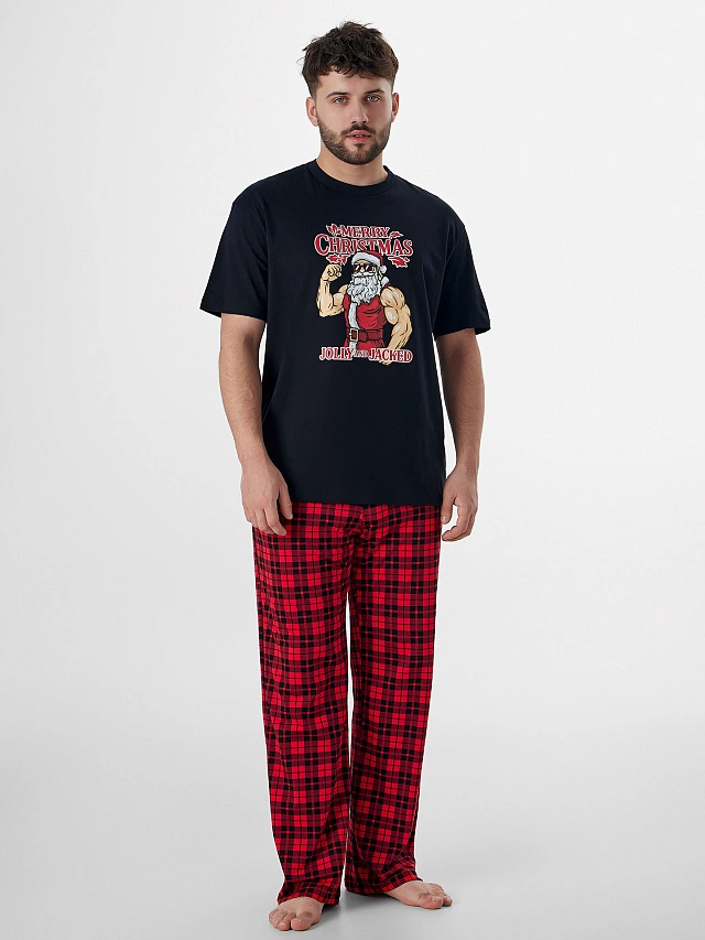 Мужской домашний комплект с новогодним принтом — уютный набор для отдыха, созданный из мягкого трикотажа. Однотонная футболка свободного силуэта с круглой горловиной украшена новогодним принтом и надписью «Счастливого Рождества. Веселья и энергии». Этот забавный акцент добавляет образу праздничного настроения и юмора, не нарушая комфорта. Такой комплект станет отличным подарком другу, который ценит чувство юмора и комфорт.