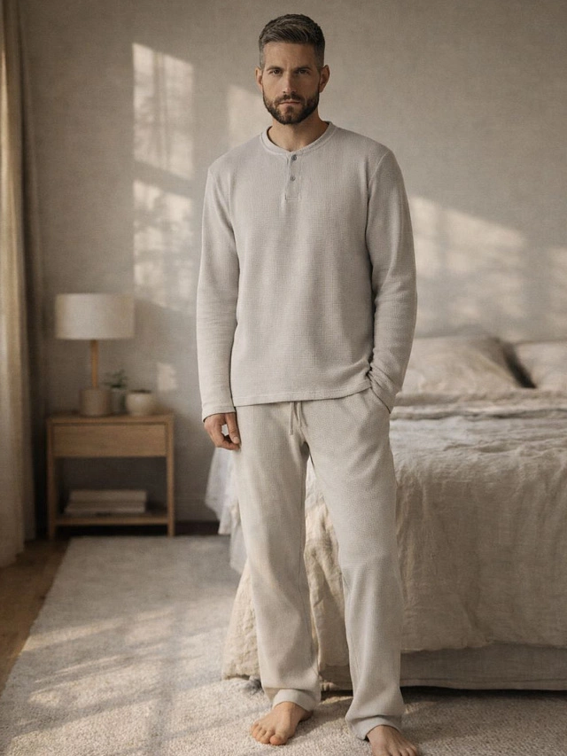 Серая мужская пижама из натурального хлопка — воплощение комфорта для полноценного отдыха. Комплект состоит из свободного джемпера и прямых брюк, которые не стесняют движений даже во время сна.