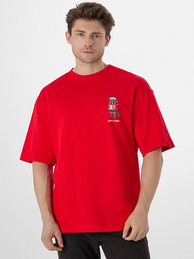 Красная мужская футболка с новогодним принтом и надписью "Готов веселиться" создана для праздничных мероприятий. Модель оверсайз со спущенной линией плеча и короткими рукавами легко сочетается с любым низом.