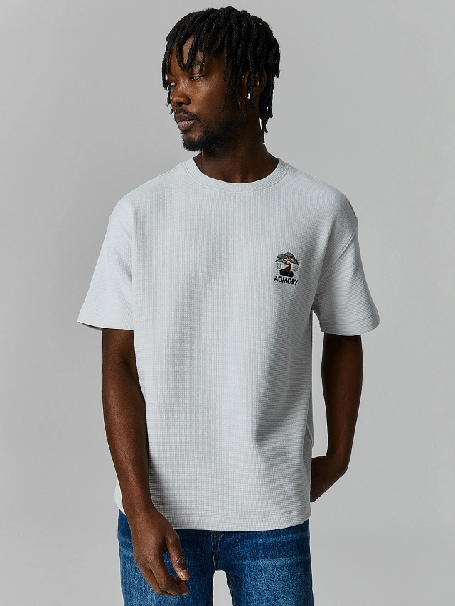 Мужская белая футболка из коллекции, вдохновлённой японской эстетикой. На футболке надпись города в Японии и иероглифы, которые переводятся как «Синий лес» или «Голубой лес». Это отсылка к бескрайним зелёным массивам, ставшим символом этих мест.