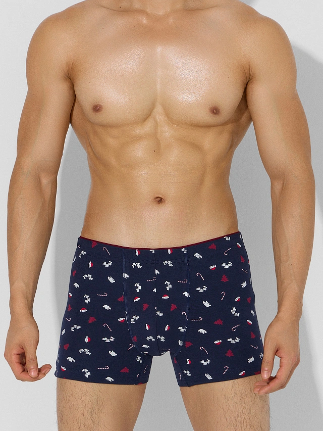 Синие мужские трусы-боксеры с новогодним принтом создадут праздничное настроение в повседневной жизни. Насыщенный синий фон служит идеальной основой для изображения новогодней атрибутики, что делает дизайн одновременно сдержанным и тематическим. Модель выполнена из эластичного хлопкового трикотажа, который обеспечивает комфортную посадку и не стесняет движений.