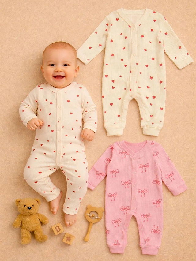 Набор из двух детских комбинезонов с милыми принтами в виде сердечек и бантиков создан для комфорта и удобства малыша. Комбинезоны выполнены из мягкого хлопка в рубчик, который обеспечивает нежность, воздухопроницаемость и бережное отношение к коже.