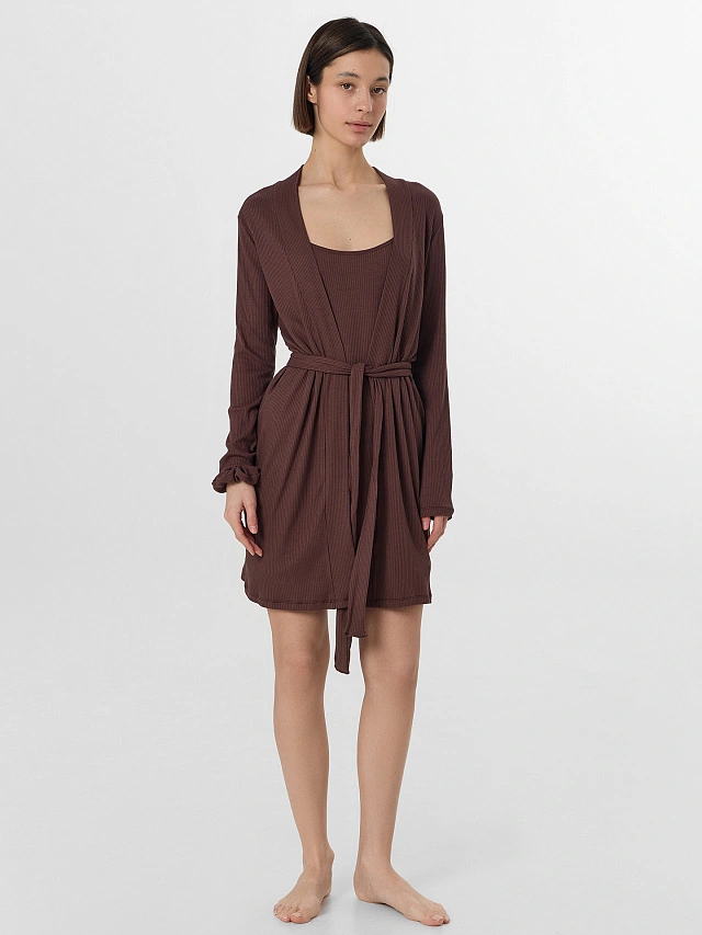 Домашний комплект для женщин — готовый набор для ухода за собой и отдыха. В него входят халат, ночная сорочка и резинка для волос, выполненные из мягкой и эластичной вискозы с добавлением эластана.
