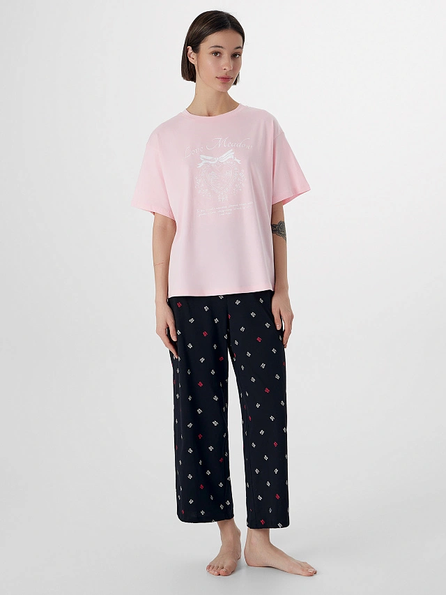 Женская пижама с надписью "На лугу сердец расцветают нежные цветы, шепчущие тайны любви и надежды" из хлопка создана для комфортного отдыха. Комплект включает джемпер прямого силуэта и свободные бриджи, выполненные из мягкого натурального хлопка, приятного к телу и обеспечивающего идеальную воздухопроницаемость. Джемпер с круглой горловиной и короткими рукавами удобно садится по фигуре, а свободный крой брюк с эластичным поясом на тесьме гарантирует полную свободу движений во время сна.
