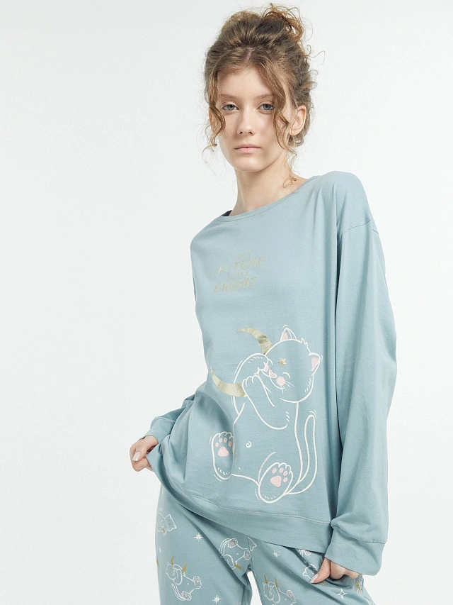 Комплект женский (джемпер, брюки) серый с принтом "котики со звездами"