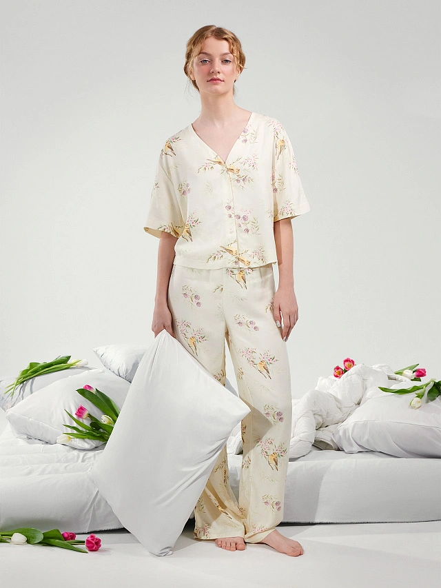 Комплект домашний женский кремовый с принтом "птички"