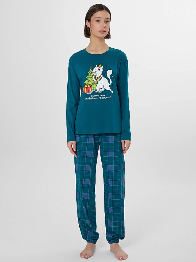 Милый женский комплект из высококачественного хлопка с принтом. Джемпер свободного силуэта с круглой горловиной и длинными рукавами. Свободные брюки, чуть зауженные к низу, длиной до косточки, с классической линией талии и эластичной тесьмой в поясе.Идеальный вариант пижамы на каждый день. Широкая размерная сетка, есть модели plus-size, в линейке много базовых и других милых расцветок пижам. Рекомендуем для сна, отдыха и домашних дел, а также в качестве приятного подарка для любимых!