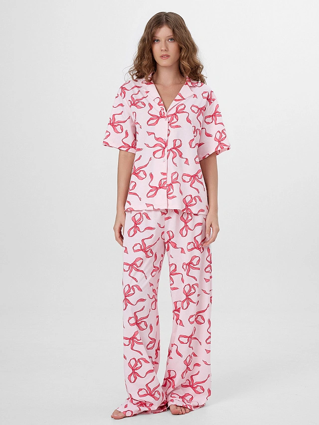 Женская домашняя пижама из рубашки и брюк создана для тех, кто ценит уют и комфорт. Натуральный хлопок обеспечивает нежность и воздухопроницаемость, даря коже приятные ощущения и полную свободу движений. Рубашка свободного кроя с отложным воротником и короткими рукавами выглядит стильно и элегантно. Классическая застежка на пуговицы удобна в использовании, а аккуратная обработка всех краев обеспечивает долговечность носки.