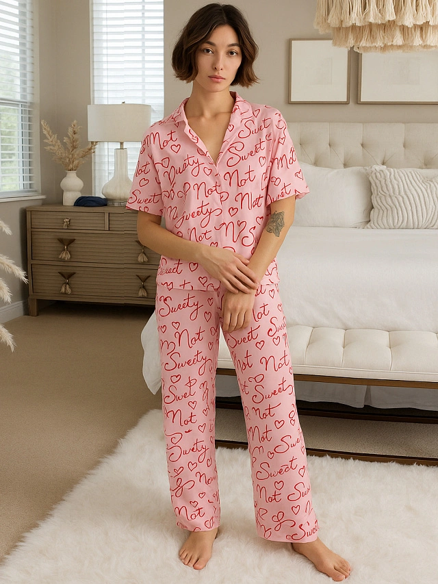 Женская домашняя пижама из рубашки и брюк создана для тех, кто ценит уют и комфорт. Натуральный хлопок обеспечивает нежность и воздухопроницаемость, даря коже приятные ощущения и полную свободу движений. Рубашка свободного кроя с отложным воротником и короткими рукавами выглядит стильно и элегантно. Классическая застежка на пуговицы удобна в использовании, а аккуратная обработка всех краев обеспечивает долговечность носки.