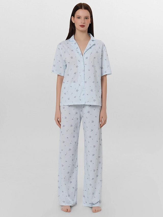Женская домашняя пижама из рубашки и брюк создана для тех, кто ценит уют и комфорт. Натуральный хлопок обеспечивает нежность и воздухопроницаемость, даря коже приятные ощущения и полную свободу движений. Рубашка свободного кроя с отложным воротником и короткими рукавами выглядит стильно и элегантно. Классическая застежка на пуговицы удобна в использовании, а аккуратная обработка всех краев обеспечивает долговечность носки.