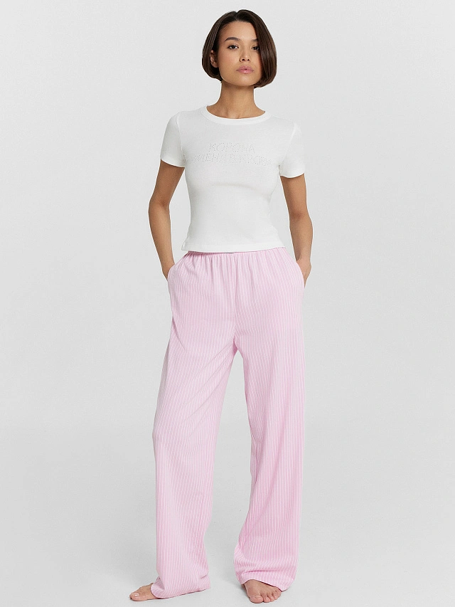 Женский домашний комплект — это гармоничное сочетание комфорта и элегантности. Футболка приталенного кроя с круглой горловиной подчеркивает фигуру и создает аккуратный силуэт. Короткие рукава делают ее практичной и удобной, а обработка нижних срезов швом вподгибку добавляет аккуратности и долговечности. Брюки свободного силуэта с посадкой на талии обеспечивают комфорт и свободу движений, идеально подходя для домашнего отдыха. Эластичный пояс гарантирует удобную посадку, а боковые карманы добавляют функциональности. Низ изделия, обработанный швом в подгибку, подчеркивает качество исполнения и надежность модели. Комплект выполнен из натурального хлопка, что обеспечивает мягкость, воздухопроницаемость и комфорт в носке. Такая пижама станет идеальным выбором для тех, кто ценит уют, стиль и практичность в домашней одежде. Рекомендуем!
