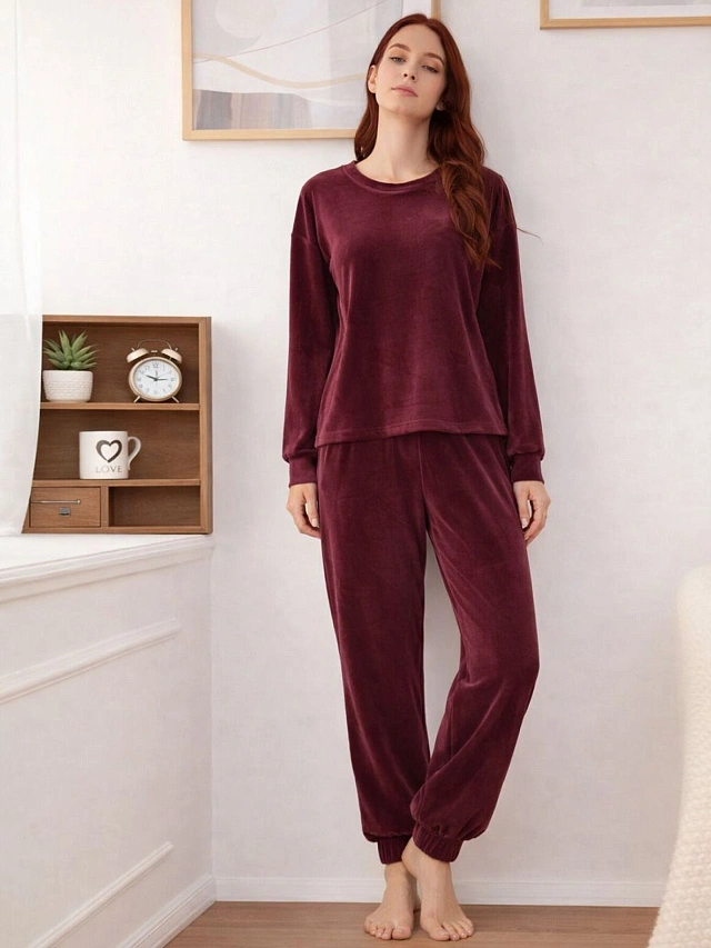 Бордовый велюровый комплект для женщин — ваш верный спутник для моментов полного расслабления и домашнего уюта. Набор состоит из джемпера прямого силуэта и свободных брюк, выполненных из мягкого велюра. Состав из полиэстера с добавлением эластана обеспечивает износостойкость, идеальное облегание и сохранение формы после многих стирок.