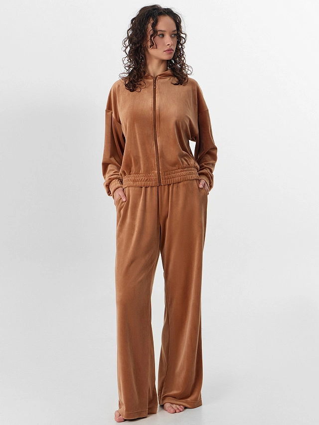 Мягкий велюровый комплект для дома создан для тех, кто ценит уют и комфорт. В набор входит толстовка с капюшоном и свободные брюки — идеальный дуэт для расслабленного отдыха. Толстовка без плечевых швов мягко облегает фигуру, не стесняя движений, а просторная горловина и широкие проймы рукавов дарят ощущение невесомости. Уютный двойной капюшон создает ощущение защищенности и комфорта, будто вы в своем личном уголке спокойствия. Эластичные манжеты на рукавах и по низу толстовки мягко фиксируют край, сохраняя тепло.