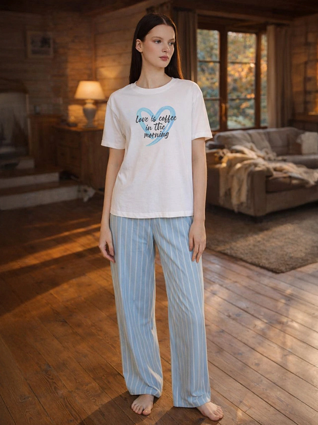 Женская домашняя пижама создана для абсолютного отдыха. Набор из футболки и брюк из хлопка подарит коже ощущение невесомой мягкости и приятной прохлады. Футболка с оригинальной надписью «Любовь — это кофе по утрам» — это уют и светлое настроение для отдыха. Прямой силуэт с круглой горловиной и короткими рукавами обеспечивает свободу движений во время сна или отдыха.