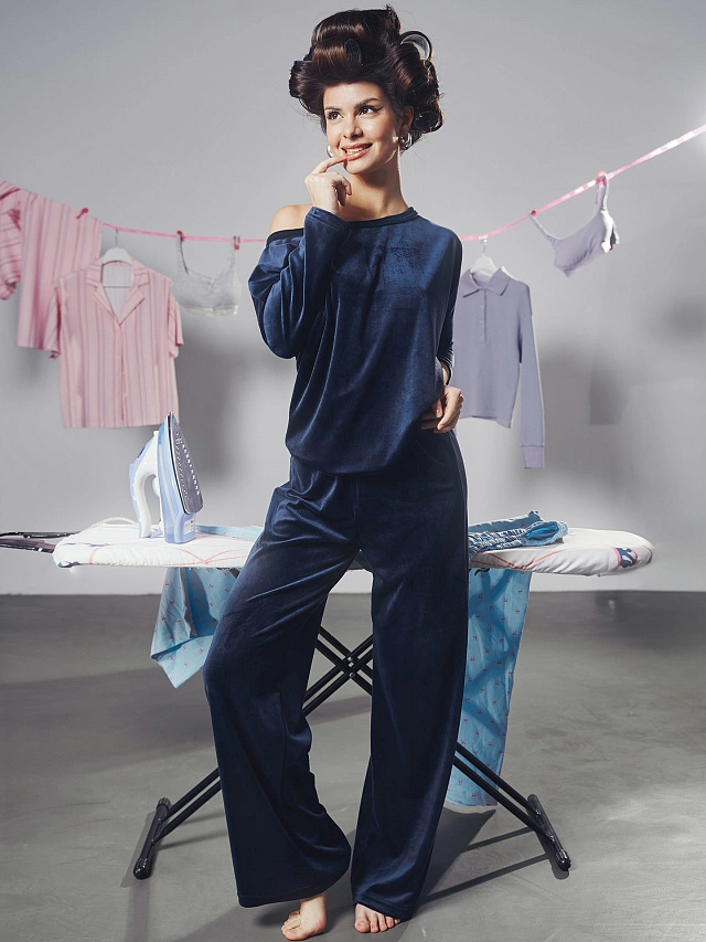 Велюровая женская пижама — это ощущение уюта и нежной роскоши. Комплект состоит из джемпера и брюк, выполненных из мягкого велюра с благородной бархатистой текстурой. Джемпер прямого силуэта с удлиненными рукавами и элегантной горловиной «лодочка» создает расслабленный и изящный вид.