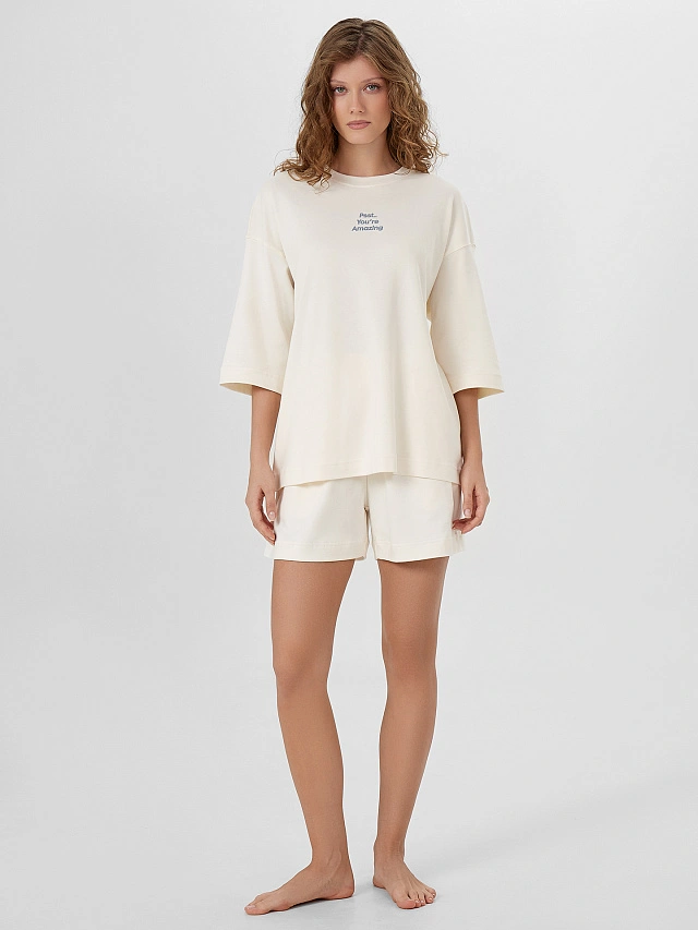 Этот комплект, состоящий из свободной футболки и шорт, идеален для отдыха и расслабления. Мягкий хлопок, из которого выполнена пижама, обеспечивает комфорт и нежность прикосновения к коже. Футболка с круглой горловиной и спущенной линией плеча не ограничивает движения, а шорты с высокой посадкой на талии и эластичным поясом дарят чувство свободы. Функциональные карманы «хулиганы» и аккуратная обработка швов подчеркивают продуманность дизайна. Если вы ищете женскую пижаму с шортами из натурального материала, этот набор станет прекрасным выбором для ежедневного использования.