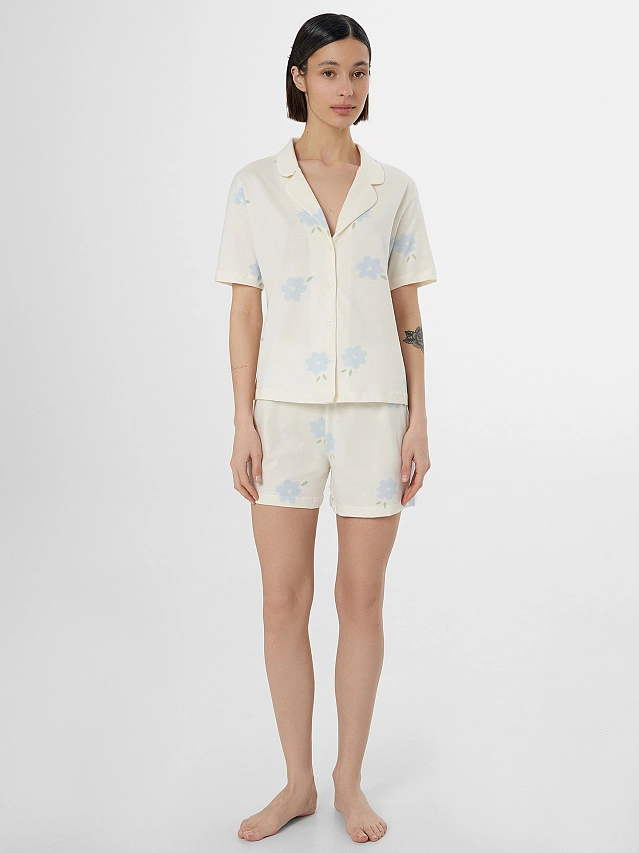 Бежевый комплект с цветочным принтом — это воплощение домашнего тепла. Рубашка с отложным воротником, выполненная из натурального хлопка, мягко струится по фигуре, даря свободу каждому движению. Короткие шорты с широким эластичным поясом бережно облегают талию, сохраняя комфорт даже во время сна.