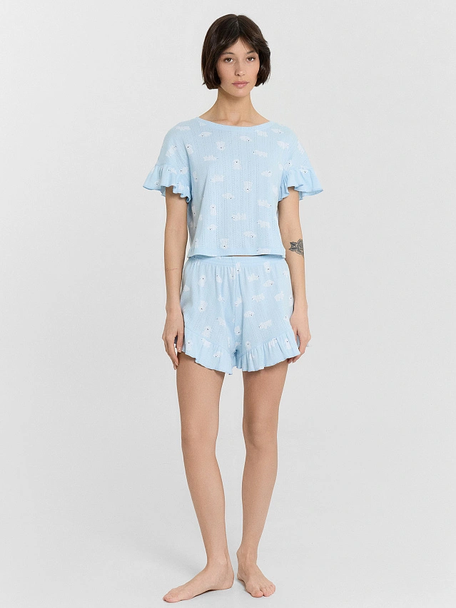 Женский домашний комплект из хлопка — это нежность, комфорт и очарование в каждой детали. Укороченный джемпер свободного силуэта с короткими рукавами украшен рюшами по низу, что придает образу легкость и романтичность. Круглая горловина и аккуратная обработка низа швом вподгибку подчеркивают лаконичный стиль и высокое качество исполнения. Шорты также выполнены в свободном крое, с комфортной посадкой на талии и эластичным поясом, который мягко фиксирует изделие, не сдавливая. Рюши по низу шорт добавляют игривости и визуальной легкости, делая комплект особенно женственным. Натуральный хлопок в составе обеспечивает мягкость, воздухопроницаемость и комфорт в течение всего дня. Такой комплект идеально подойдет для отдыха дома, сна или уютных вечеров.