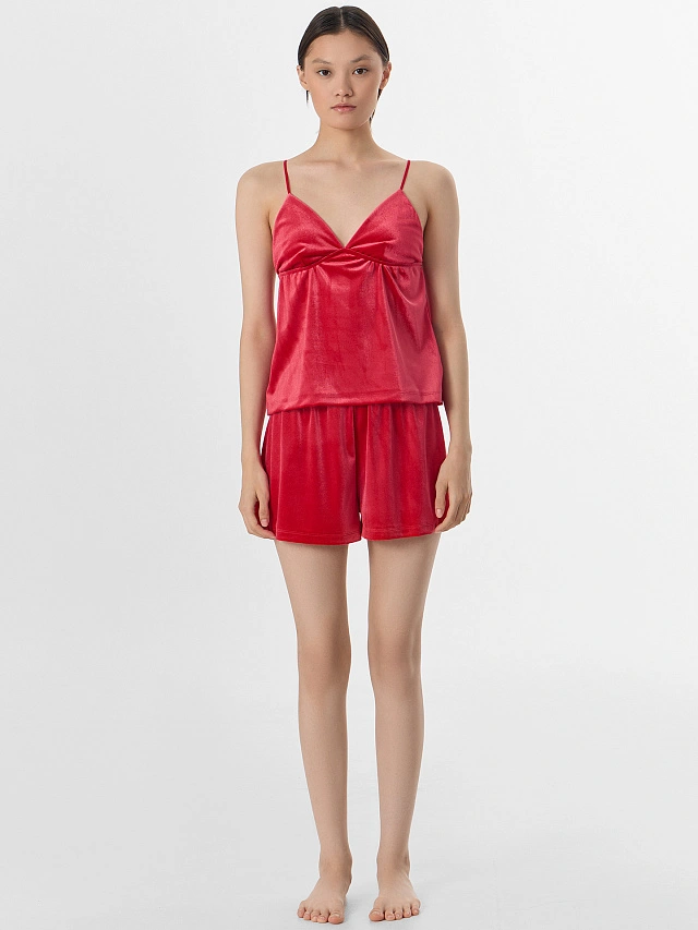 Красная велюровая домашняя пижама — это сочетание уюта и стильного акцента. Комплект из блузы и шорт выполнен из мягкого велюра, который обладает бархатистой текстурой и приятно облегает тело. Блуза полуприлегающего силуэта с отдельно скроенными чашками на подкладке обеспечивает точную поддержку и аккуратный вид.