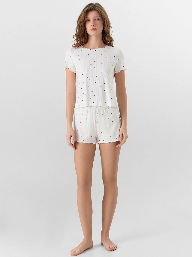 Джемпер полуприлегающего силуэта с круглой горловиной и короткими рукавами создает расслабленный и женственный вид. Шорты с эластичным поясом обеспечивают удобную посадку и свободу движений во время домашних дел. Нежный принт в виде сердечек добавляет образу романтичности.