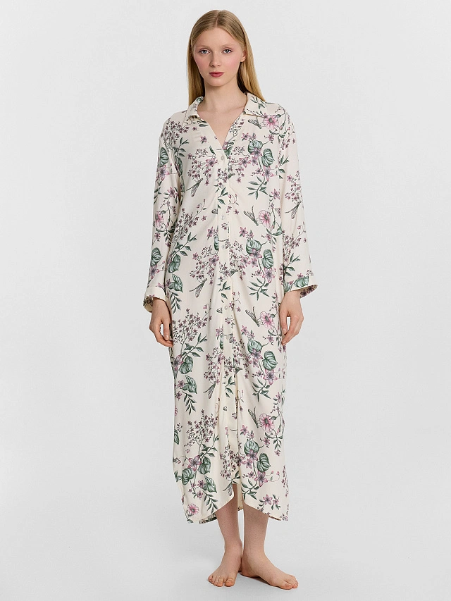 Платье женское домашнее прямого силуэта. Перед с центральной застежкой и отрезной планкой на пуговицах . Горловина V-образной формы, в горловину втачан воротник отложной. Рукав 7/8 укорочен, втачной. По низу рукава отрезная манжета. Нижний срез платья обработан швом вподгибку. Платье длиной ниже колена, в боковых швах обработаны разрезы.
