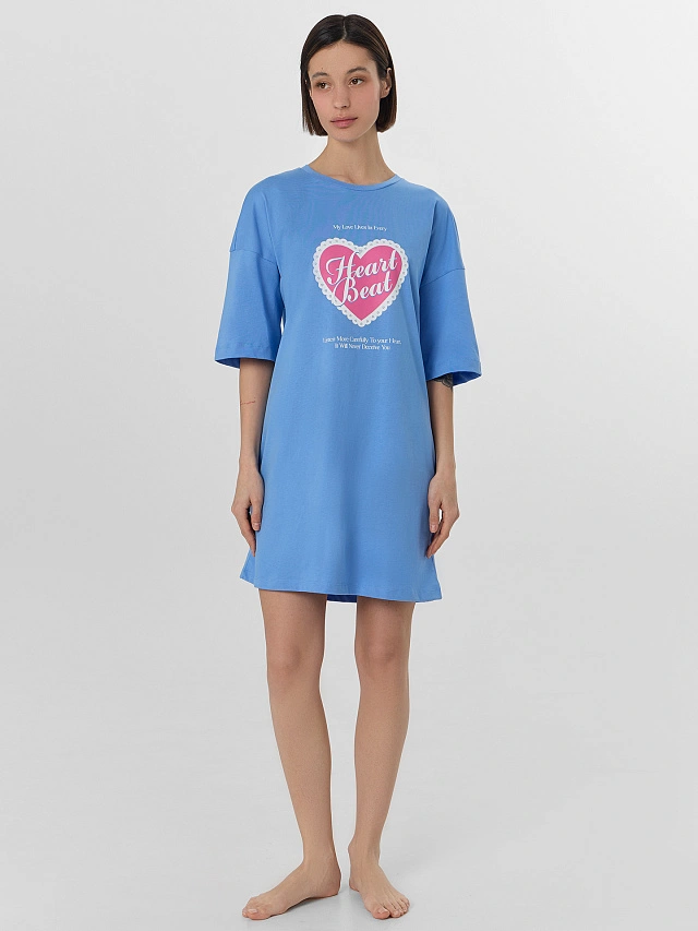 Синяя домашняя туника с надписью «Моя любовь живёт в каждом ударе сердца. Прислушайся внимательнее к своему сердцу — оно никогда не обманет» — это воплощение нежности и душевного тепла в вашем домашнем гардеробе. Очаровательная модель с лиричным принтом создана для моментов полного спокойствия и умиротворения.