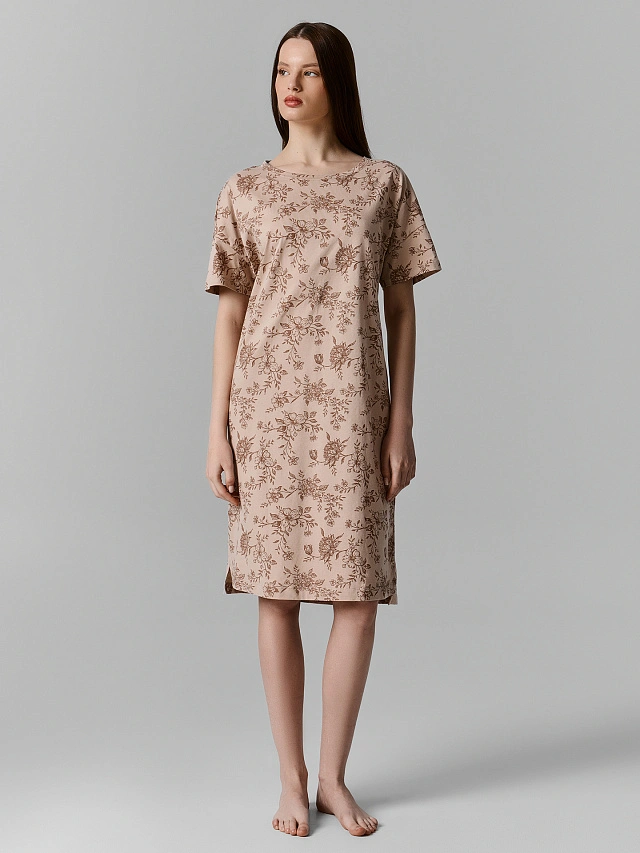 Бежевая ночная сорочка с цветочным принтом — мягкая и удобная вещь для сна и спокойного отдыха. Свободный силуэт не сковывает движений, длина до колена делает модель универсальной. Короткие рукава и круглый вырез горловины добавляют образу лаконичности, а боковые разрезы — лёгкости и свободы.