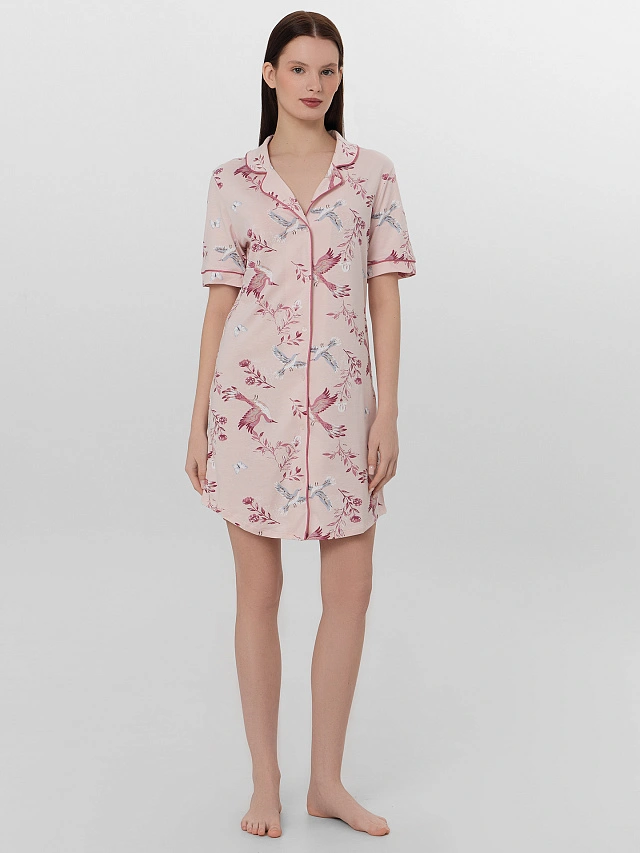 Розовая ночная сорочка с нежным принтом птиц создает образ утонченной женственности и спокойного отдыха. Прямой силуэт и длина выше колена обеспечивают комфорт и легкость движений во время сна.