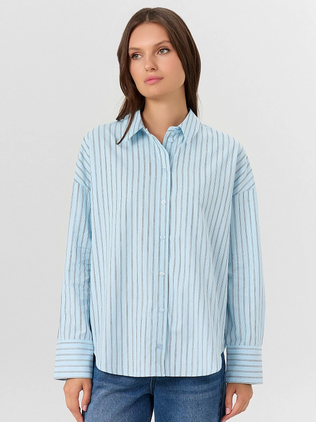 Свободный крой не сковывает движений, а тонкие вертикальные полосы визуально вытягивают силуэт, добавляя образу легкости. Женская рубашка голубого цвета легко сочетается с классическими брюками, джинсами или юбкой, делая её идеальным вариантом для офиса, прогулок или встреч с друзьями. Круглая горловина плавно переходит в отложной воротник, создавая гармоничный и утончённый силуэт.