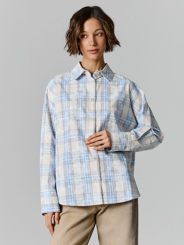 Бежево-голубая клетка легко сочетается с базовыми цветами — белым, чёрным, джинсовым, коричневым. Универсальный вариант для прогулок, встреч с друзьями, работы или отдыха