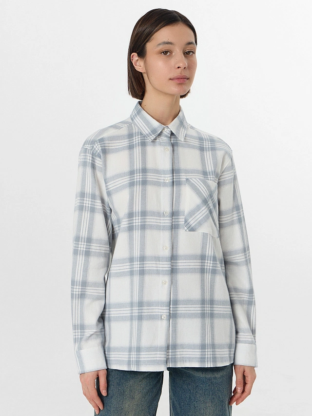 Женская рубашка из хлопка в клетку — современный базовый элемент гардероба, где классическая форма встречается с актуальным дизайном. Модель прямого силуэта с отложным воротником и длинными рукавами на манжетах создает лаконичный вид.