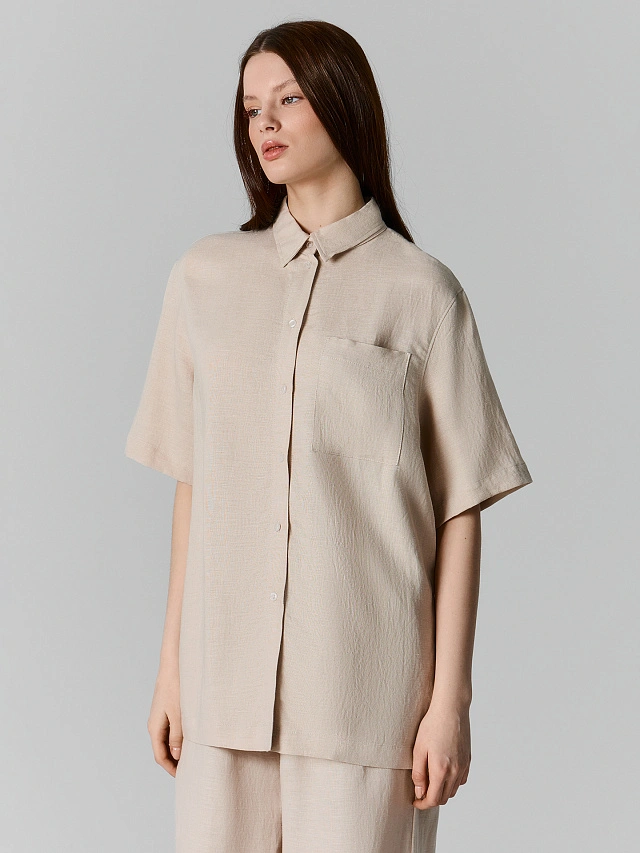 Женская рубашка свободного силуэта выполнена из нежного сочетания вискозы и натурального льна, что придает ей особые преимущества. Вискоза обеспечивает мягкость и приятное ощущение на коже, а также обладает отличной воздухопроницаемостью, что помогает поддерживать комфортную температуру тела. Натуральный лён, в свою очередь, добавляет прочности и долговечности изделию, а также обладает гипоаллергенными свойствами. Модель оснащена застежкой на пуговицы и накладным карманом слева на груди. Короткие рукава со спущенной линией плеча и свободный крой придают этой рубашке стильный и современный вид, делая её отличным выбором для повседневного гардероба.