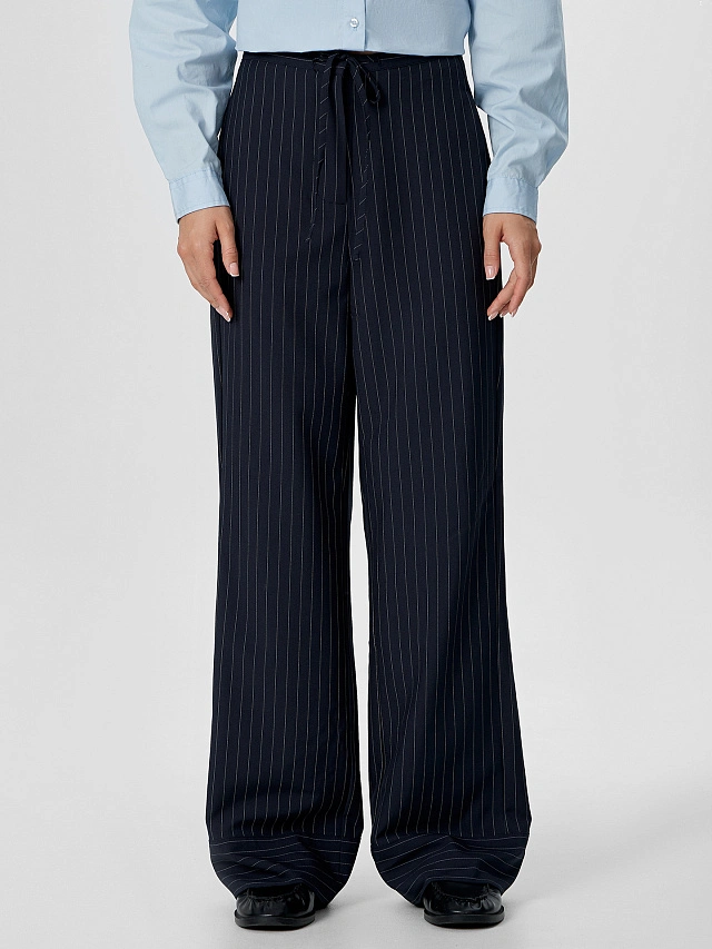 Синие брюки в белую полоску — это элегантность и комфорт в вашем гардеробе. Модель с высокой посадкой мягко облегает талию, визуально удлиняя ноги и создавая стройный силуэт. Свободный прямой крой обеспечивает полную свободу движений, делая брюки идеальными для офиса, прогулок или отдыха.