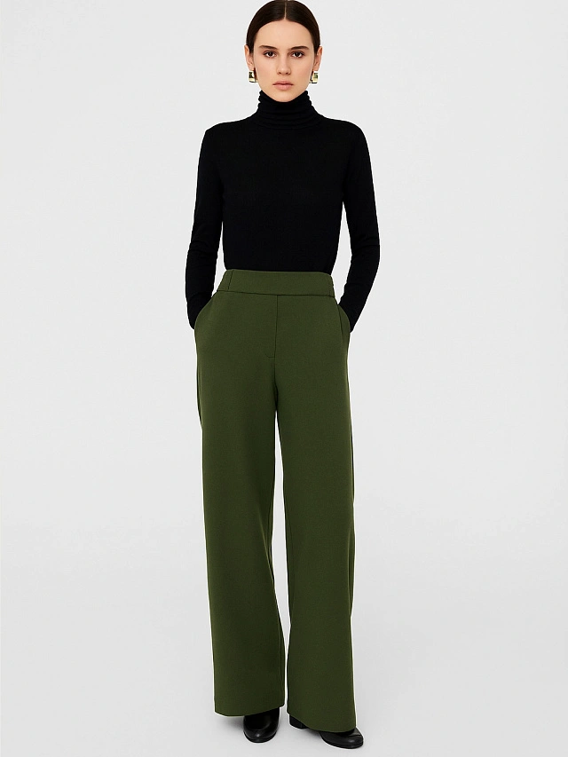 Натуральный зеленый оттенок и актуальный крой позволяют сочетать брюки с разными верхами — от объемных свитеров до строгих блуз. Идеальный выбор для офиса, учебы или прогулок, где важны комфорт и стиль.