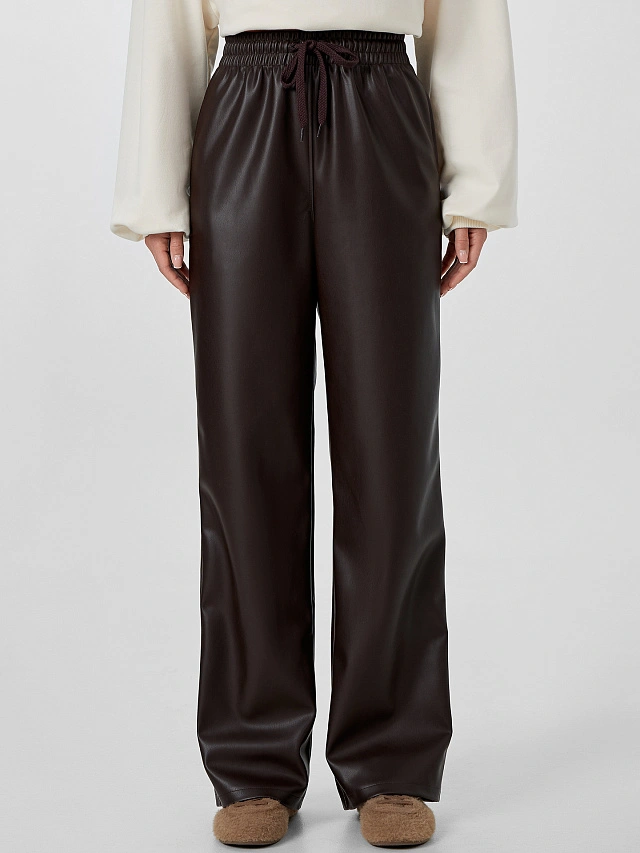 Коричневые кожаные брюки — must-have для создания стильного осеннего образа. Модель прямого кроя с высокой посадкой удобно садится по фигуре, подчеркивая талию. Эластичный пояс со шнурком позволяет регулировать посадку, а практичные боковые карманы дополняют функциональность.