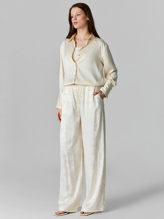 Бежевые прямые брюки с цветочным принтом — лёгкая и женственная вещь для тёплых дней. Свободный силуэт и средняя посадка не сковывают движений. Пояс с мягкой эластичной резинкой внутри — он удобно сидит на талии, не пережимая и не доставляя дискомфорта. Спереди карманы с подкладкой из той же ткани.