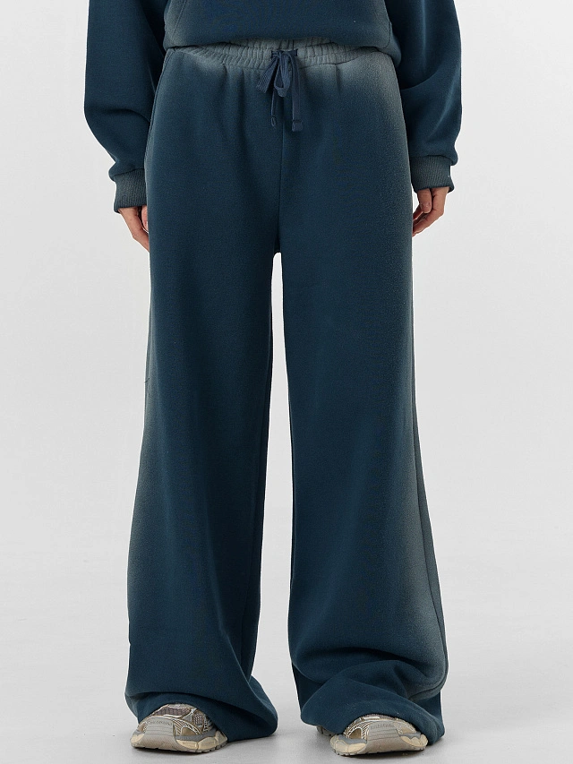 Зеленые брюки со стильными декоративными потертостями создают образ с характером. Модель с мягким начесом внутри обеспечивает дополнительное тепло и уют в прохладную погоду. Свободный силуэт, плавно переходящий в легкую расклешенность, обеспечивает комфорт и свободу движений. Пояс брюк мягко облегает талию благодаря широкой резинке, а декоративный шнурок позволяет дополнительно регулировать посадку. Удобные передние карманы расположены по бокам и имеют мягкую внутреннюю отделку для комфорта рук.