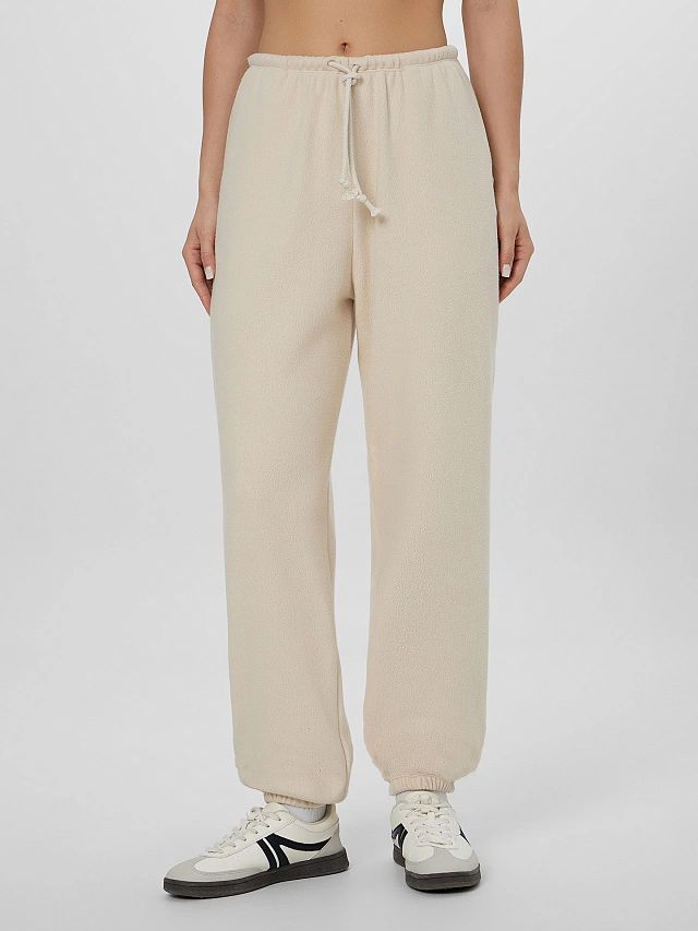 Бежевые спортивные брюки для женщин из мягкого флиса созданы для активного образа жизни в прохладную погоду. Модель прямого кроя с средней посадкой удобно сидит по фигуре, не стесняя движений. Брюки выполнены из полиэстера — этот материал отличается легкостью, способностью сохранять тепло и быстро отводить влагу, обеспечивая комфорт при физической активности.