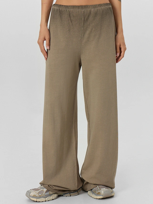 Пояс с эластичной тесьмой внутри мягко фиксируется на талии, не сдавливая живот. Боковые карманы с подкладкой из основного материала удобны для мелочей, а аккуратная обработка нижних срезов сохраняет форму брюк после стирок. Серая цветовая гамма с эффектом эйсид легко сочетается с базовыми вещами: футболками, свитерами, рубашками или кедами.