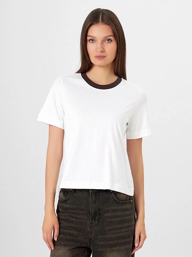 Женская футболка прямого силуэта с контрастной окантовкой — это стильная и универсальная модель, которая легко впишется в повседневный гардероб. Слегка укороченная длина придает образу современный характер, а широкий короткий рукав и свободный крой обеспечивают комфорт и свободу движений. Круглая горловина оформлена широкой обтачкой из рибаны, что подчеркивает аккуратность исполнения и помогает сохранять форму после стирок. Широкие подгибки на рукавах и нижнем срезе добавляют визуальной выразительности и подчеркивают качество пошива. Трикотажная кулирка — мягкий, дышащий материал, приятный к телу и устойчивый к деформации, благодаря чему футболка сохраняет свежий вид даже при активной носке. Контрастная окантовка делает модель более выразительной и добавляет красочный акцент, который легко сочетается с джинсами, шортами или юбками.