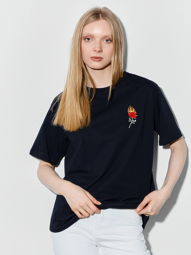 Черная футболка с небольшим принтом розы — выразительная и удобная вещь для повседневных образов. Свободный силуэт, круглый вырез, спущенная линия плеча и углублённая пройма создают расслабленный, современный вид, в котором комфортно двигаться. Широкие рукава чуть выше локтя добавляют лёгкости и делают футболку особенно удобной в тёплую погоду.