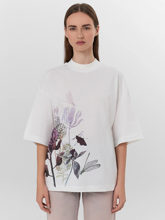 Белая женская футболка с печатью — это универсальная модель для создания лёгких повседневных образов. Свободный силуэт с круглой горловиной и короткими рукавами, дополненными спущенной линией плеча, обеспечивает комфортную посадку и полную свободу движений.