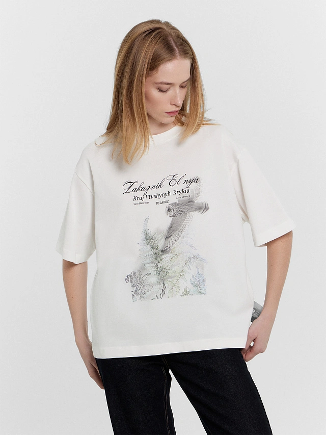 Стильная однотонная оверсайз футболка женская из высококачественного хлопка c печатью в виде птиц и надписи "Zakaznik El`nya - Kraj Ptushynyh Krylau / Заповедник Ельня - Край птичьих крыльев". Горловина круглой формы. Свободу движений гарантируют спущенная линия плеча и углубленная пройма. Рукава широкие, чуть выше локтя. Легкий и натуральный материал футболки женской хорошо пропускает воздух, слегка тянется и не сковывает движений. Такая футболка женская, отлично подойдет для создания casual образа. В линейке представлены базовые модели, а также есть интересные варианты с принтами. Широкий размерный ряд. Порадуйте себя и своих близких практичными подарками от Mark Formelle!