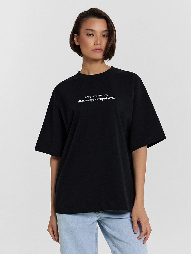Футболка женская черная с надписью "Есть что во мне психокорректировать?"